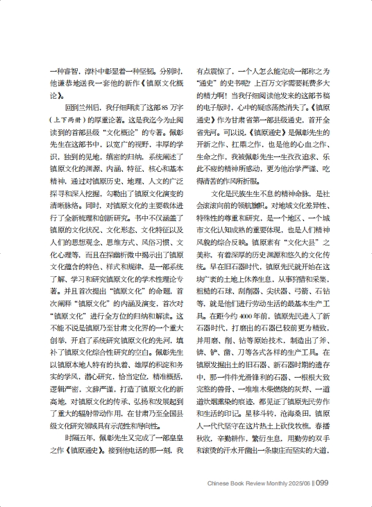 回到蘭州后,我仔細(xì)拜讀了這部85萬字(上下兩冊)的厚重論著。這是我迄今為止閱讀到的首部縣級“文化概論”的專著。佩彰先生在這部書中,以寬廣的視野,豐厚的學(xué)識,獨到的見地,縝密的歸納,系統(tǒng)闡述了鎮(zhèn)原文化的淵源、內(nèi)涵、特征、核心和基本精神,通過對鎮(zhèn)原歷史、地理、人文的廣泛探尋和深入挖掘,勾勒出了鎮(zhèn)原文化演變的清晰脈絡(luò)。同時,對鎮(zhèn)原文化的主要載體進(jìn)行了全新梳理和創(chuàng)新研究。書中不僅涵蓋了鎮(zhèn)原的文化狀況、文化形態(tài)、文化特征以及人們的思想觀念、思維方式、風(fēng)俗習(xí)慣、文化心理等,而且在探幽析微中揭示出了鎮(zhèn)原文化蘊含的特色、樣式和規(guī)律,是一部系統(tǒng)了解、學(xué)習(xí)和研究鎮(zhèn)原文化的學(xué)術(shù)性理論專著。并且首次提出“鎮(zhèn)原文化”的命題,首次闡釋“鎮(zhèn)原文化”的內(nèi)涵及演變,首次對“鎮(zhèn)原文化”進(jìn)行全方位的歸納和解讀。這不能不說是鎮(zhèn)原乃至甘肅文化界的一個重大創(chuàng)舉,開啟了系統(tǒng)研究鎮(zhèn)原文化的先河,填補了鎮(zhèn)原文化綜合性研究的空白。佩彰先生以鎮(zhèn)原本地人特有的執(zhí)著、雄厚的積淀和務(wù)實的學(xué)風(fēng),潛心研究,恰當(dāng)定位,精準(zhǔn)概括,邏輯嚴(yán)密,文辭嚴(yán)謹(jǐn),打造了鎮(zhèn)原文化的新高地,對鎮(zhèn)原文化的傳承、弘揚和發(fā)展起到了重大的輻射帶動作用,在甘肅乃至全國縣級文化研究領(lǐng)域具有示范性和導(dǎo)向性。