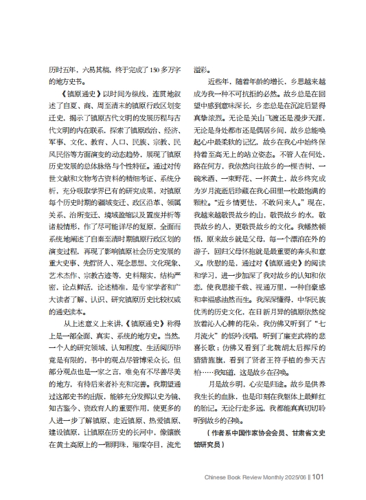 從上述意義上來講,《鎮(zhèn)原通史》稱得上是一部全面、真實、系統(tǒng)的地方史。當(dāng)然,一個人的研究領(lǐng)域、認(rèn)知程度、生活閱歷畢竟是有限的,書中的觀點盡管博采眾長,但部分觀點也是一家之言,難免有不盡善盡美的地方,有待后來者補充和完善。我期望通過這部史書的出版,能夠充分發(fā)揮以史為鏡、知古鑒今、資政育人的重要作用,使更多的人進(jìn)一步了解鎮(zhèn)原、走近鎮(zhèn)原、熱愛鎮(zhèn)原、建設(shè)鎮(zhèn)原,讓鎮(zhèn)原在歷史的長河中,像鑲嵌在黃土高原上的一顆明珠,璀璨奪目,流光溢彩。