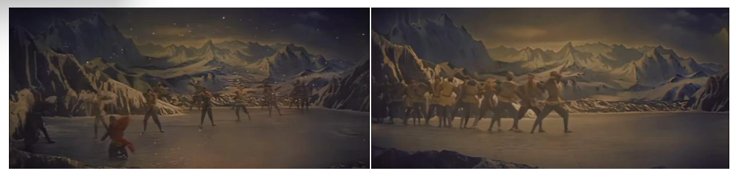 在表現(xiàn)行軍征程時,舞者以身體前傾的大跨步姿態(tài),沿群山布景走出巨大的“S”型曲線。這不是簡單的隊形變換,它首先在視覺上營造出千軍萬馬綿延不絕的雄渾意象。同時,“S”形曲線本身藝術化地傳達了“道路是曲折的,前途是光明的”這一革命哲理。舞者整齊劃一、重心下沉的堅定步伐,與沙幕光影營造出的風沙漫天效果相結合,共同體現(xiàn)紅軍在艱難險阻中依然定向不移的鋼鐵意志。