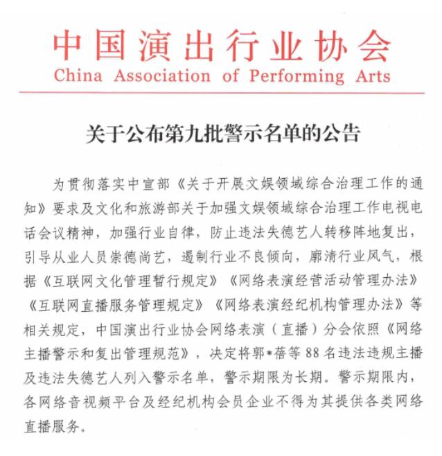 中國演出行業(yè)協(xié)會(huì)網(wǎng)絡(luò)表演(直播)分會(huì)近日發(fā)布了第九批網(wǎng)絡(luò)主播警示名單,包括“鐵山靠”“郭老師”兩名職業(yè)主播和“吳亦凡”“鄭爽”“張哲瀚”三名演員在內(nèi)的88名主播將在行業(yè)內(nèi)被實(shí)行聯(lián)合抵制和懲戒。這是違法失德藝人首次被納入網(wǎng)絡(luò)主播警示名單中,防止劣跡藝人轉(zhuǎn)移陣地復(fù)出。