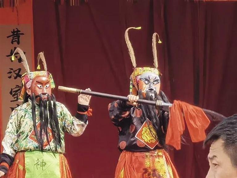 隴南市武都魚龍鄉(xiāng)陽山村高山戲又稱“演故事”“走過場”等,發(fā)源于隴南武都高山地區(qū),是從隴南當(dāng)?shù)氐拿耖g祭祀活動和傳統(tǒng)社火中孕育、演變而來的戲曲劇種。高山戲演出程式多種多樣,語言生動活潑、幽默詼諧,2008年被列入第二批國家級非物質(zhì)文化遺產(chǎn)保護(hù)名錄。停止演出近20年后,在當(dāng)?shù)匚幕鞴懿块T的大力支持下,2022年正月陽山村恢復(fù)了高山戲的演出。