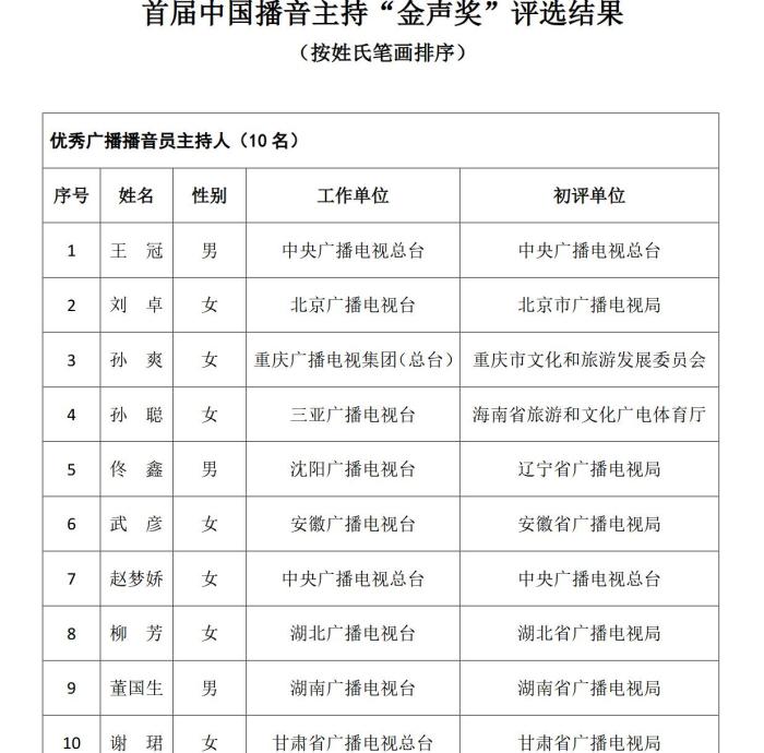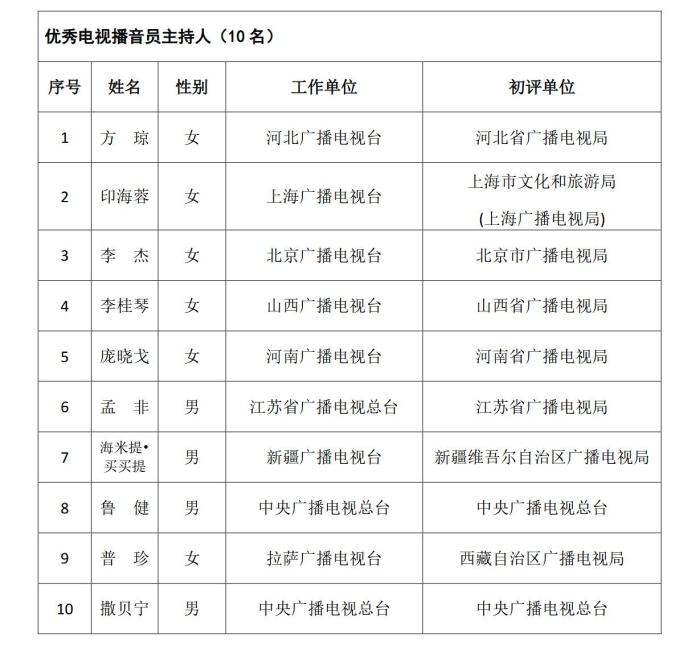 《通知》指出,根據(jù)《國家廣播電視總局辦公廳關于組織參加中國廣播電視節(jié)目獎•首屆中國播音主持“金聲獎”評選工作的通知》(廣電辦發(fā)〔2021〕277號),經(jīng)過初評、復評和終評,評選出優(yōu)秀廣播播音員主持人、優(yōu)秀電視播音員主持人各10名?,F(xiàn)將評選結果予以公示,公示期為5個工作日。
