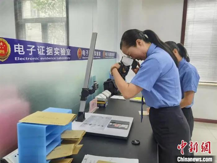 圖為電子證據實驗室司法鑒定人對涉案手機進行編號、拍照。 崔琳攝