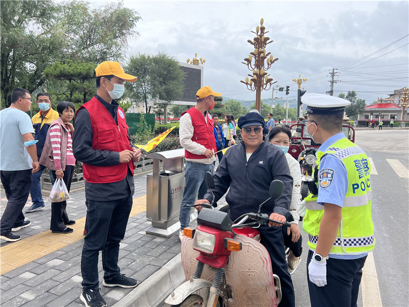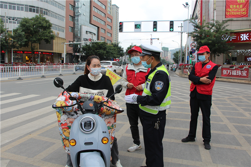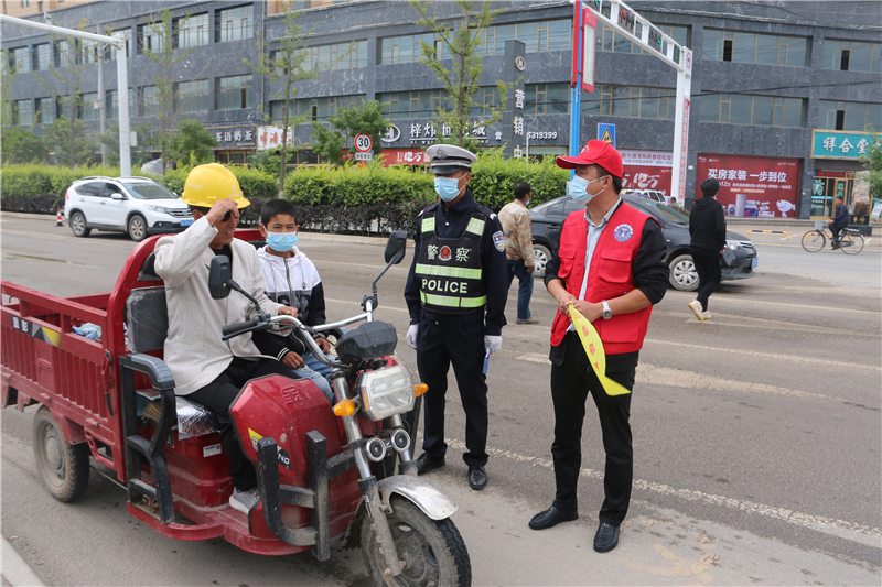 9月28日上午,參加“駕駛?cè)藢W(xué)習(xí)教育體驗(yàn)”活動的記滿分駕駛?cè)苏诟拭C定西岷縣小南門十字路口對不文明交通行為認(rèn)真的進(jìn)行著勸導(dǎo)。