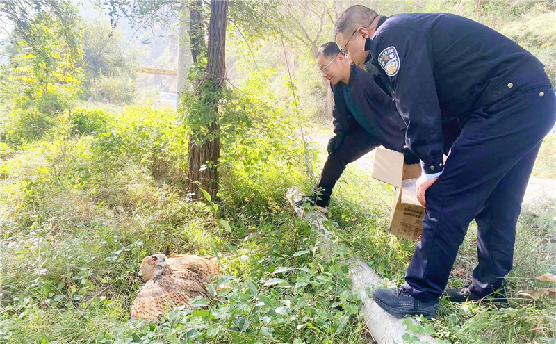 到達現(xiàn)場后,經(jīng)確認該野生物種屬于國家二級保護動物、雕鸮(貓頭鷹)。通過現(xiàn)場檢查,該貓頭鷹身體狀況良好,無外傷,活動情況良好,具有野外生存能力,符合放生條件。于當日,民警將其帶至野外放歸大自然。