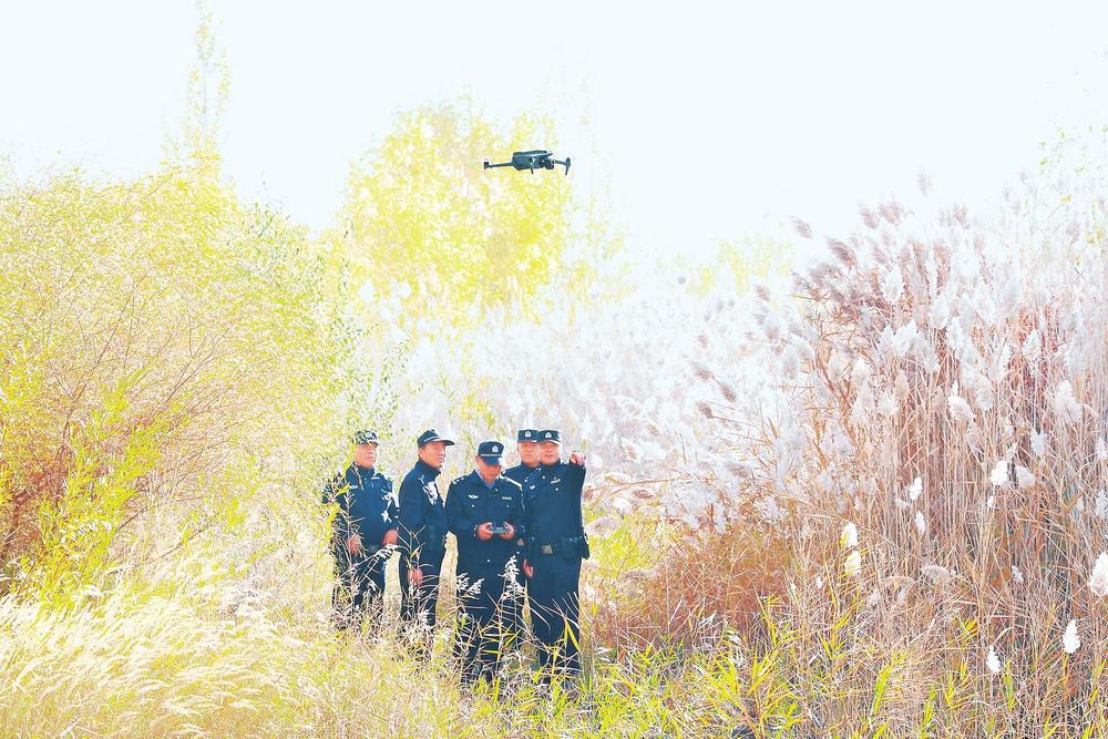 民警在濕地公園利用無(wú)人機(jī)開(kāi)展巡查。