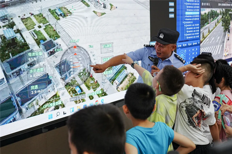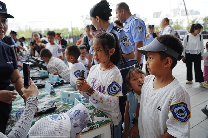 帶著興奮和期待,小朋友們的警營(yíng)探索之旅開(kāi)始了!在奧體中心警務(wù)站和警航作戰(zhàn)單元,他們沉浸式參觀了現(xiàn)代警務(wù)工作和警用無(wú)人機(jī)的指揮調(diào)度,直觀了解了公安工作的日常場(chǎng)景。另一邊,小朋友們?cè)诿窬闹笇?dǎo)下,一個(gè)個(gè)親手拿著警用武器裝備零距離“拍照打卡”,“這個(gè)好酷!”“看我的!”小朋友們的驚嘆聲此起彼伏。