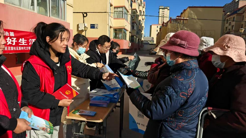 工作人員在社區(qū)內(nèi)開(kāi)展普法宣傳活動(dòng),向居民發(fā)放法律宣傳資料。