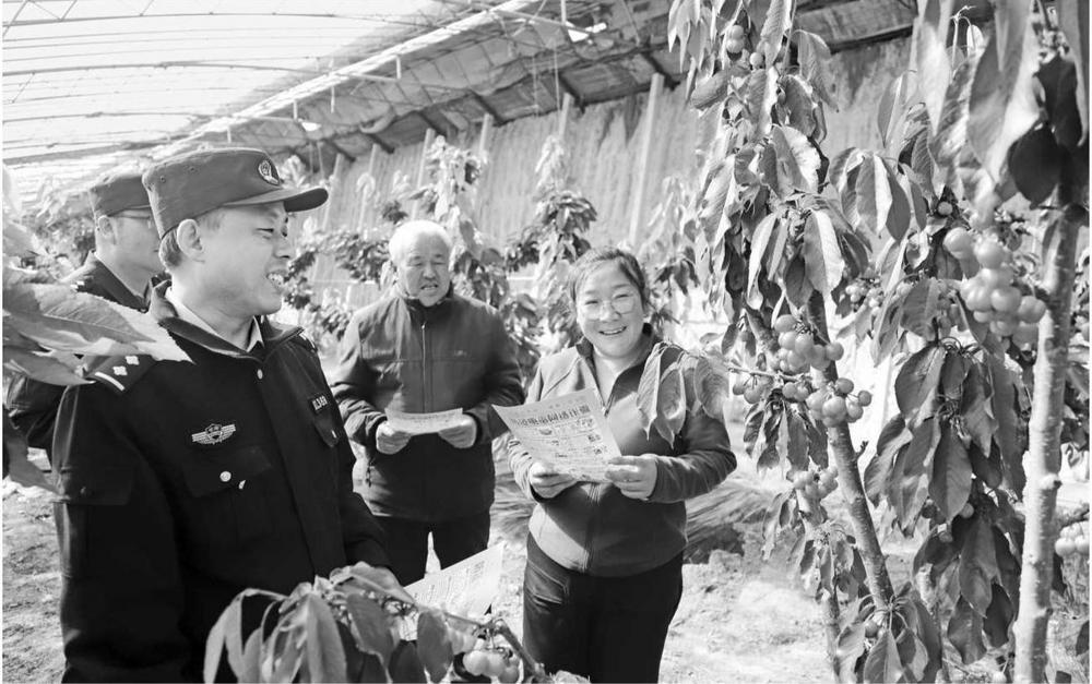3月10日,西峰公安分局顯勝派出所民警走進(jìn)櫻桃大棚開展食品安全宣傳活動(dòng)。新甘肅·甘肅法治報(bào)通訊員 左棟 攝