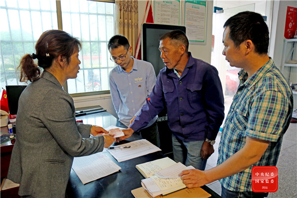湖南省益陽市資陽區(qū)長春鎮(zhèn)幸福村村級義務監(jiān)督員主動履職,全程參與并監(jiān)督發(fā)放產(chǎn)業(yè)扶貧分紅資金,確保每一筆民生資金落到實處。(湖南省益陽市資陽區(qū)紀委監(jiān)委 張偉敏 攝)