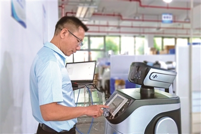 福建省福州市,服務(wù)機(jī)器人應(yīng)用技術(shù)員謝茂皇正在對機(jī)器人產(chǎn)品的功能進(jìn)行調(diào)試。周磊 攝