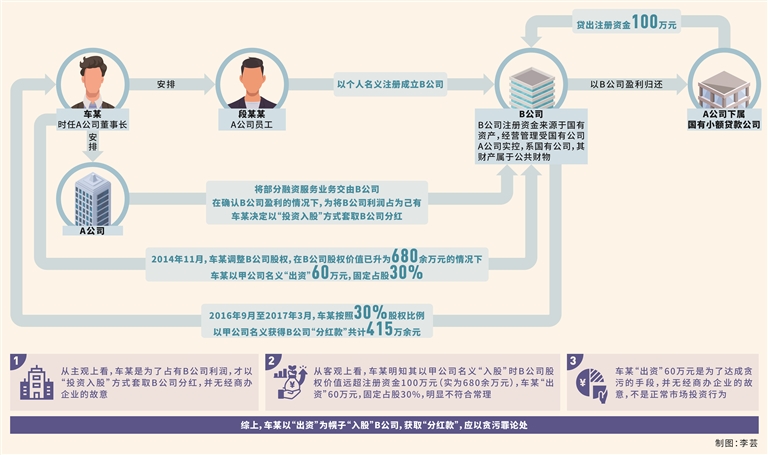 洪超蘭:本案中,從客觀上看,車某安排A公司相關(guān)業(yè)務(wù)部門將高新園區(qū)融資服務(wù)業(yè)務(wù)交由B公司經(jīng)營,且該業(yè)務(wù)由國有單位信用背書,利潤高、無風險,在車某“出資”前B公司凈資產(chǎn)已遠超注冊資本,車某以甲公司名義按照原出資額100萬元確定的股權(quán)比例“入股”B公司不符合正常投資行為,而是獲得國有公司確定性預(yù)期利益的手段。從主觀上看,根據(jù)車某供述及相關(guān)證人證言,車某見B公司的融資服務(wù)業(yè)務(wù)量在上升,幾乎沒有經(jīng)營成本,獲利空間巨大,便利用職務(wù)便利,以甲公司名義“投資入股”B公司,其主觀目的是為了獲取B公司的確定性預(yù)期收益,而非投資經(jīng)商辦企業(yè)。