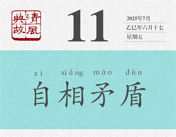 “自相矛盾”的本義是,不管是自己的矛刺穿了自己的盾,還是自己的盾無法被自己的矛刺穿,都會陷入不能自圓其說的難堪境地。后人則以“自相矛盾”為典,比喻一個人前面說的和后面說的、前面做的和后面做的相互抵觸,或者自己所說與所做、自己所為與所述互相沖突。也指同一機關(guān)、同一機構(gòu)中各個部門、各個成員之間說法不統(tǒng)一,行為不一致。宋人王觀國《學(xué)林·言行》:“圣賢言行,要當顧踐,毋使自相矛盾。”