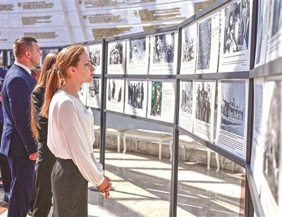 定格共同的勝利,重溫跨越時空的二戰(zhàn)記憶。“銘記歷史 開創(chuàng)未來”——紀念中國人民抗日戰(zhàn)爭暨世界反法西斯戰(zhàn)爭勝利80周年圖片展正在白俄羅斯國立偉大衛(wèi)國戰(zhàn)爭歷史博物館展出。圖為觀眾在參觀展覽。新華社記者 張超群 攝
