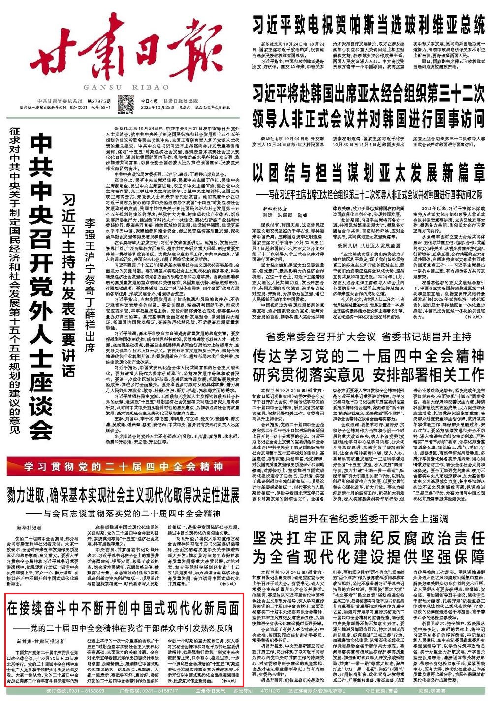 中國共產(chǎn)黨第二十屆中央委員會第四次全體會議,于10月20日至23日在北京舉行。黨的二十屆四中全會精神在全省廣大黨員和干部群眾中引發(fā)熱烈反響。大家一致認為,黨的二十屆四中全會是在向第二個百年奮斗目標進軍的新征程上舉行的一次十分重要的會議。“十五五”時期是基本實現(xiàn)社會主義現(xiàn)代化夯實基礎、全面發(fā)力的關鍵時期。全會對未來五年我國發(fā)展作出頂層設計和戰(zhàn)略擘畫,是乘勢而上、接續(xù)推進中國式現(xiàn)代化建設的又一次總動員、總部署。大家一致表示,要把學習好、宣傳好、貫徹好黨的二十屆四中全會精神作為當前和今后一個時期的重大政治任務,深入學習貫徹全會精神和習近平總書記重要講話精神,把思想和行動統(tǒng)一到黨中央決策部署上來,只爭朝夕、奮發(fā)進取,一步一個腳印把全會描繪的“十五五”時期經(jīng)濟社會發(fā)展宏偉藍圖變?yōu)槊篮矛F(xiàn)實,不斷開創(chuàng)以中國式現(xiàn)代化全面推進強國建設、民族復興偉業(yè)新局面。