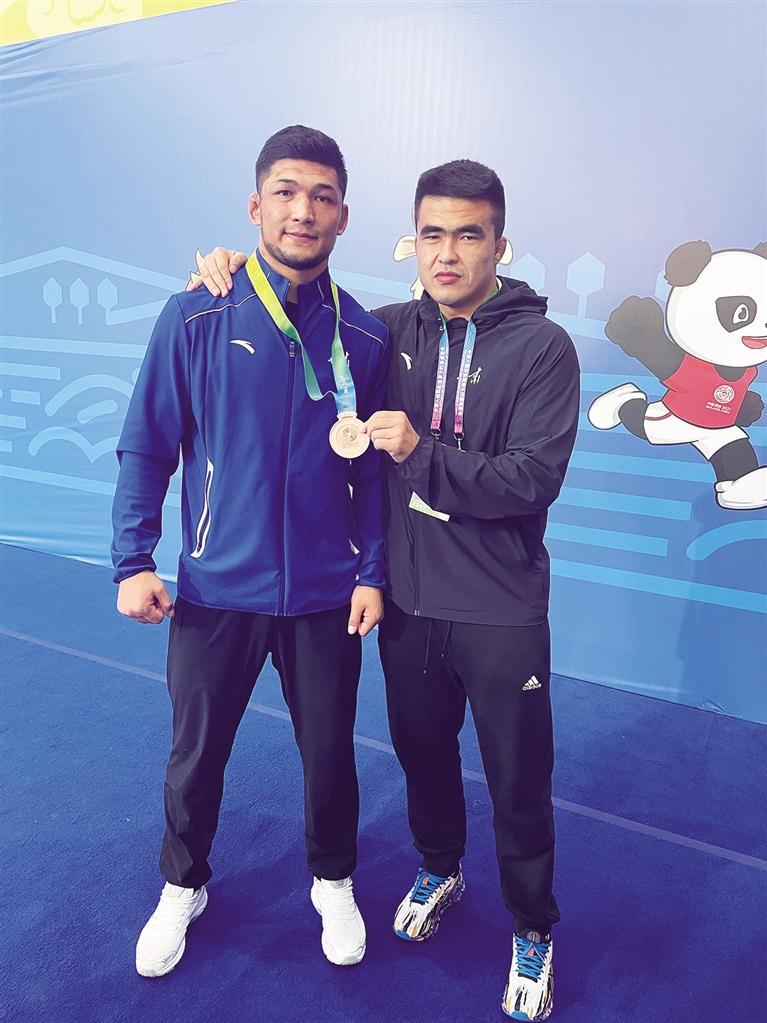 木黑特·吐?tīng)栠d別克(左)與教練合影