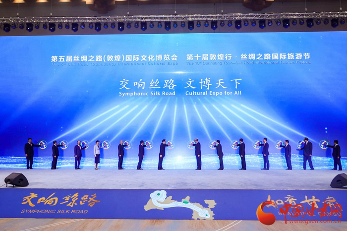 第五屆絲綢之路(敦煌)國際文化博覽會和第十屆敦煌行·絲綢之路國際旅游節(jié)于2021年9月24日—26日在甘肅省敦煌市隆重舉行。中共中央政治局委員、中央書記處書記、中宣部部長黃坤明以視頻形式出席開幕式暨高峰會議并發(fā)表主旨演講,300多名國外、國際組織及國內(nèi)省區(qū)市代表現(xiàn)場參加會議,400多萬網(wǎng)友線上參加有關(guān)活動。大會以習(xí)近平新時代中國特色社會主義思想為指導(dǎo),認(rèn)真落實(shí)“一帶一路”倡議,以線上線下相結(jié)合的方式舉辦一系列主體活動,有力促進(jìn)絲路沿線各國文化交流與旅游合作,有效增進(jìn)文化認(rèn)同與情感共鳴,是一次展示中國文化自信、共商“一帶一路”建設(shè)、推動文旅融合發(fā)展的盛會,是一次提升甘肅對外影響力、展示開放新形象、凝聚發(fā)展新動力的盛會,得到了國際社會的廣泛贊譽(yù)和一致好評。