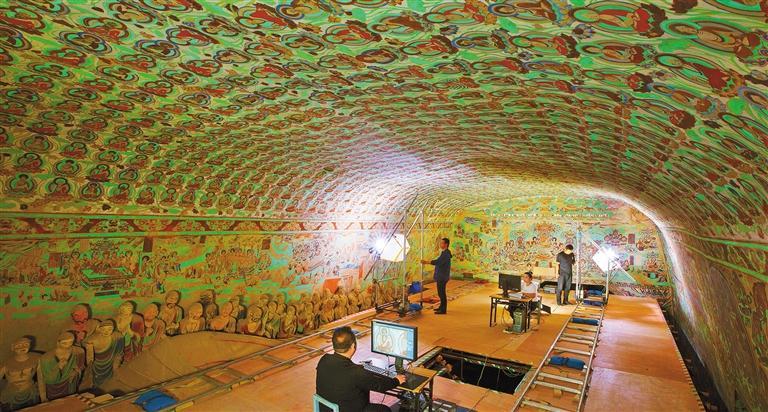 莫高窟第148窟數(shù)字化采集工作現(xiàn)場(chǎng)。敦煌研究院在國(guó)內(nèi)率先進(jìn)行文物數(shù)字化的探索研究,形成了一套科學(xué)的壁畫(huà)彩塑數(shù)字化技術(shù),制定了14項(xiàng)文物數(shù)字化保護(hù)技術(shù)標(biāo)準(zhǔn)與規(guī)范。