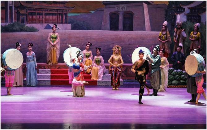 舞劇《絲路花雨》取材于敦煌莫高窟壁畫藝術,融合了中國古典舞、印度舞、黑巾舞、波斯馬鈴舞、波斯酒舞、土耳其舞、盤上舞、新疆舞等各種藝術形式。該劇首創(chuàng)于1979年,甘肅省歌舞劇院于2008年修排了新版《絲路花雨》,并不斷進行創(chuàng)新。