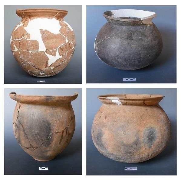 古城村遺址面積約4.2萬平方米,現(xiàn)存的貝丘堆積最厚處達(dá)6.5米,由大量尾部被敲破的螺螄殼與灰土層交替堆疊形成。碳十四測定年代為距今3600至2500年,約相當(dāng)于中原地區(qū)的商代至兩周時(shí)期。商代遺存可分為早晚兩段,早段發(fā)現(xiàn)保存完整的橢圓形環(huán)壕聚落,由中心臺(tái)地、外圍環(huán)壕和護(hù)坡組成,中心臺(tái)地面積約27000平方米,環(huán)壕和護(hù)坡周長約600米,這種聚落格局一直延續(xù)至兩周時(shí)期。商代晚段發(fā)現(xiàn)一批土坑墓和甕棺葬。兩周時(shí)期的遺存以房址、螺殼堆、灰燼、活動(dòng)面等居住類遺跡為主,房址多為方形半地穴式。出土青銅器、陶器、玉器、石器、骨器、木器等文物4000余件。