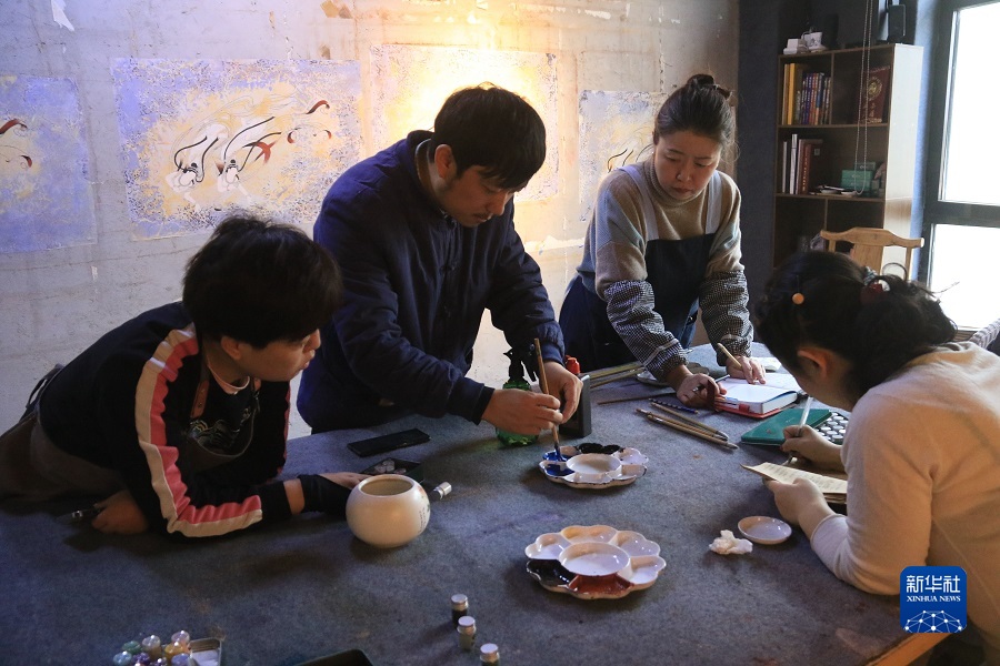 2月22日,在敦煌小鎮(zhèn)鳴沙書院,藝術(shù)工作者張杰龍(中)指導(dǎo)學(xué)員進(jìn)行顏料調(diào)色。
