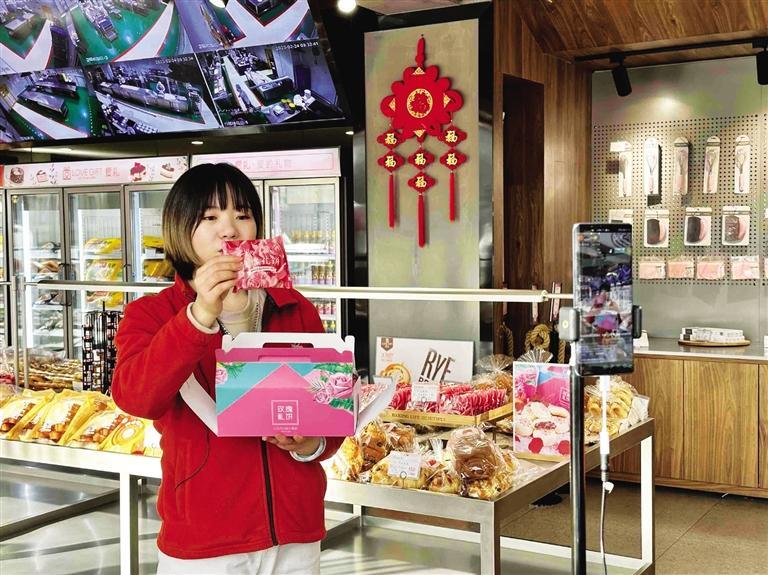 “第一次走進(jìn)直播間的粉絲一定要入手玫瑰禮餅,它是采用蘭州苦水玫瑰制作的……”每天上午,位于九州中路的愛(ài)禮烘焙生活工廠店內(nèi)一角,工作人員都在直播售貨。剛走進(jìn)店里就能聞到撲鼻而來(lái)的糕點(diǎn)香味,琳瑯滿目的商品讓人應(yīng)接不暇。