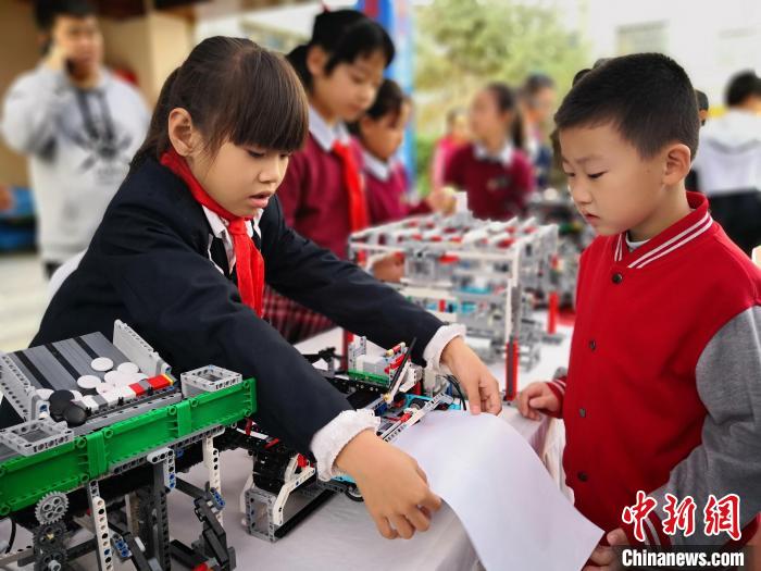 圖為蘭州市城關(guān)區(qū)青少年科技創(chuàng)新大賽上,用樂高創(chuàng)作的打印機(jī)打印圖畫吸引學(xué)生觀看。(資料圖)劉薛梅攝