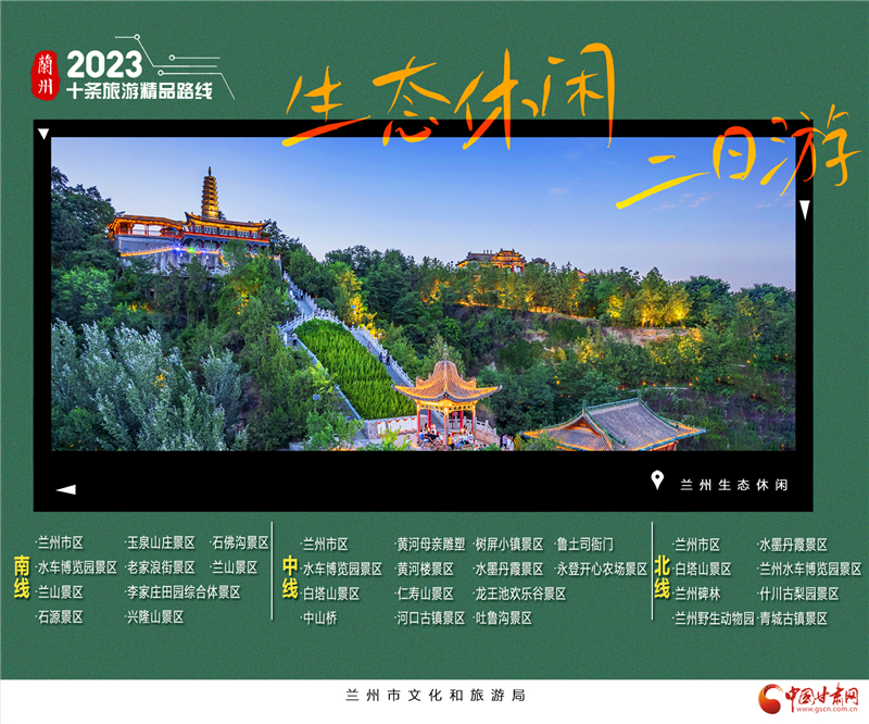 3.蘭州生態(tài)休閑2日游。這里有蘭山景區(qū),泡一壺茗茶覽金城夜景;這里有玉泉山莊,約三兩摯友慢品農(nóng)家風(fēng)味;這里有李家莊田園綜合體,瓜田李下享天倫之樂;或者直接遁入興隆山,隱入深山自逍遙,當(dāng)半日山居隱士。“蘭州生態(tài)休閑2日游”三條線,分別為南線、中線和北線。