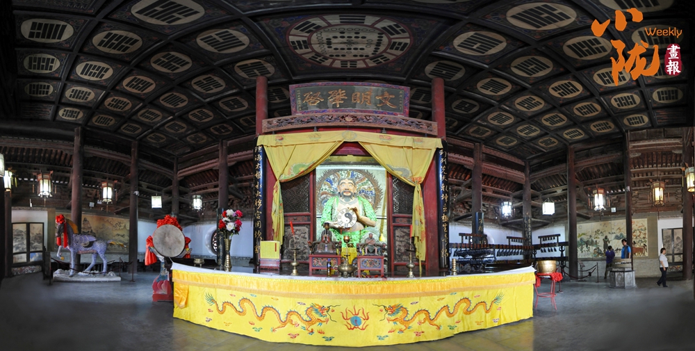 先天殿莊嚴(yán)肅穆,殿內(nèi)正中便是高達(dá)3米的人文始祖伏羲坐身塑像,樹葉披身,手持八卦盤,氣宇軒昂,雙目炯炯凝視前方,神龕上方懸掛著清嘉慶時(shí)州牧王賜均書“文明肇啟”巨匾,仰頭上望,頂上繪有河圖洛書、六十四卦,令人肅然起敬。