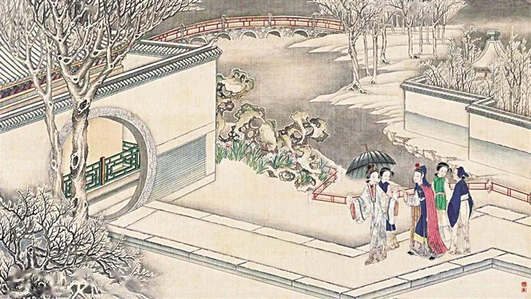 著名紅學(xué)家周汝昌曾評論清代孫溫《紅樓夢》繪本是“紅樓瑰寶”,其中一處細節(jié)就配得上這種評論。賈政攜寶玉和眾客游覽大觀園的繪制中,孫溫用了13幅畫并以焦點游移的手法,一路將賈政等人的路線詳細描繪出來,跟著畫面而走,觀者可以看到瀟湘館、蘅蕪院、沁芳亭、沁芳橋等大觀園景觀,令人嘆為觀止。