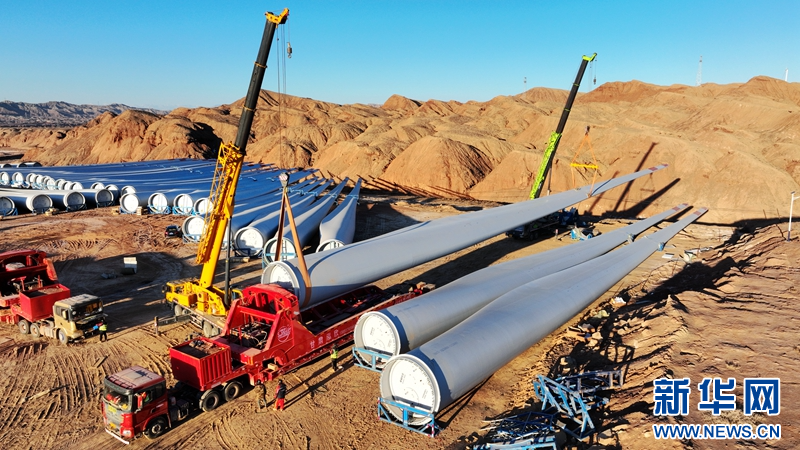 隆冬季節(jié),在甘肅省張掖市甘州區(qū)平山湖風(fēng)電基地國家電投10萬千瓦風(fēng)電項目建設(shè)工地,工人正在進(jìn)行風(fēng)機(jī)葉片吊裝作業(yè)。