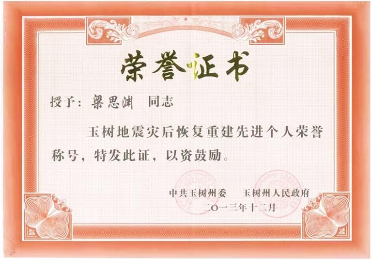 他一直這樣嚴(yán)于要求自己。因在格薩爾王賓館地震遺址維修保護(hù)項(xiàng)目中作出突出貢獻(xiàn),梁思淵被玉樹州委、州政府評為“玉樹地震災(zāi)后恢復(fù)重建先進(jìn)個(gè)人”。疫情期間,他主動(dòng)請纓,參與雁南路街道防疫物資運(yùn)輸保障任務(wù),轉(zhuǎn)運(yùn)物資總計(jì)150多趟次。