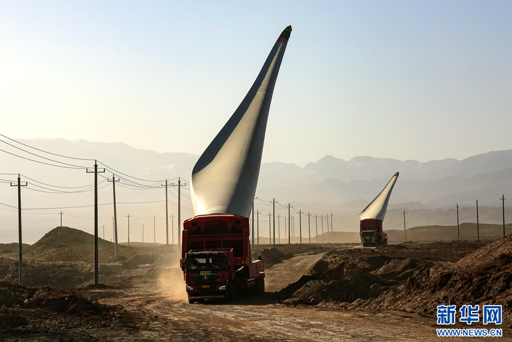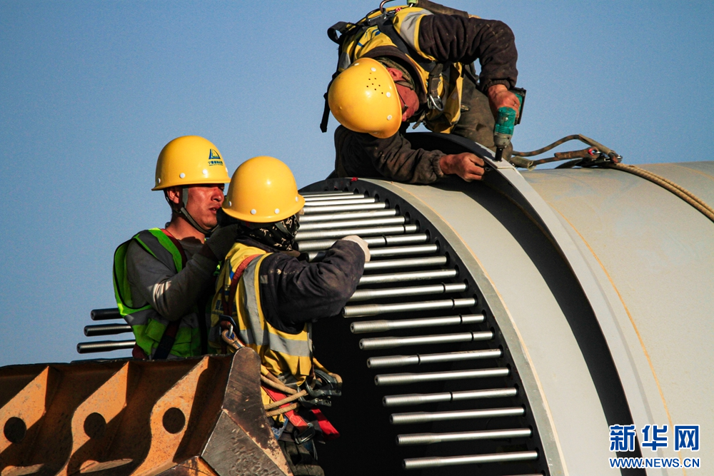 近日,在甘肅省張掖市甘州區(qū)平山湖20千瓦風(fēng)電施工現(xiàn)場,工人們緊張有序地進行風(fēng)電設(shè)備安裝工作。新華網(wǎng)發(fā)(陳禮 攝)