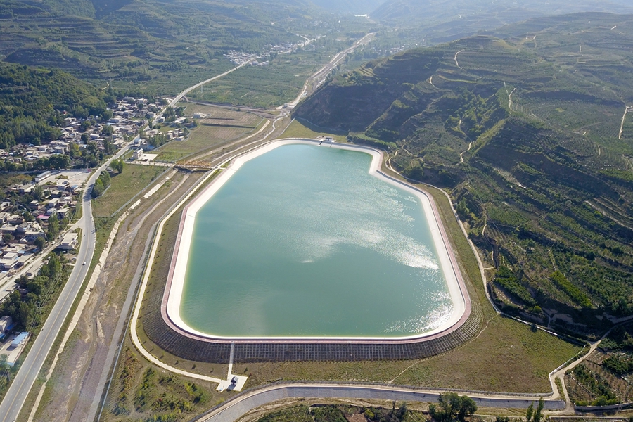 這是在天水市拍攝的已投用的天水城區(qū)引洮供水工程楊家灣調(diào)蓄水池(無人機照片)。新華社記者范培珅攝