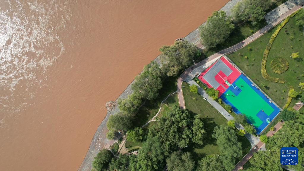 這是位于蘭州市城關(guān)區(qū)黃河北岸的蘭州馬拉松公園一處籃球場(chǎng)(9月24日攝,無人機(jī)照片)。新華社記者陳斌攝