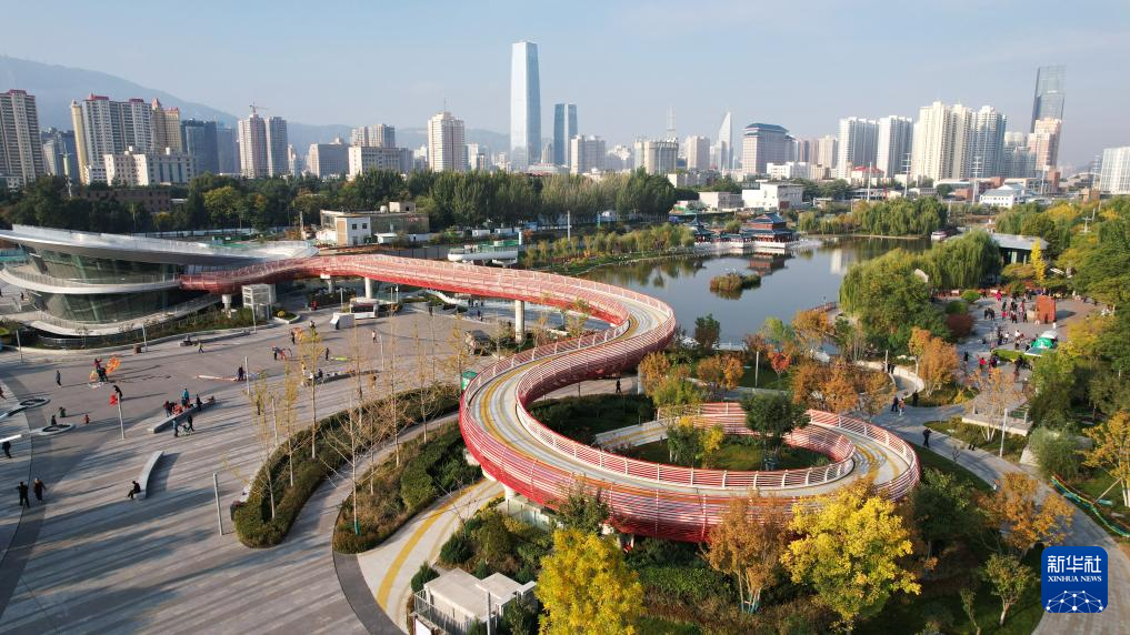 這是位于蘭州市城關(guān)區(qū)黃河北岸的馬拉松公園(10月17日攝,無人機(jī)照片)。新華社記者陳斌攝