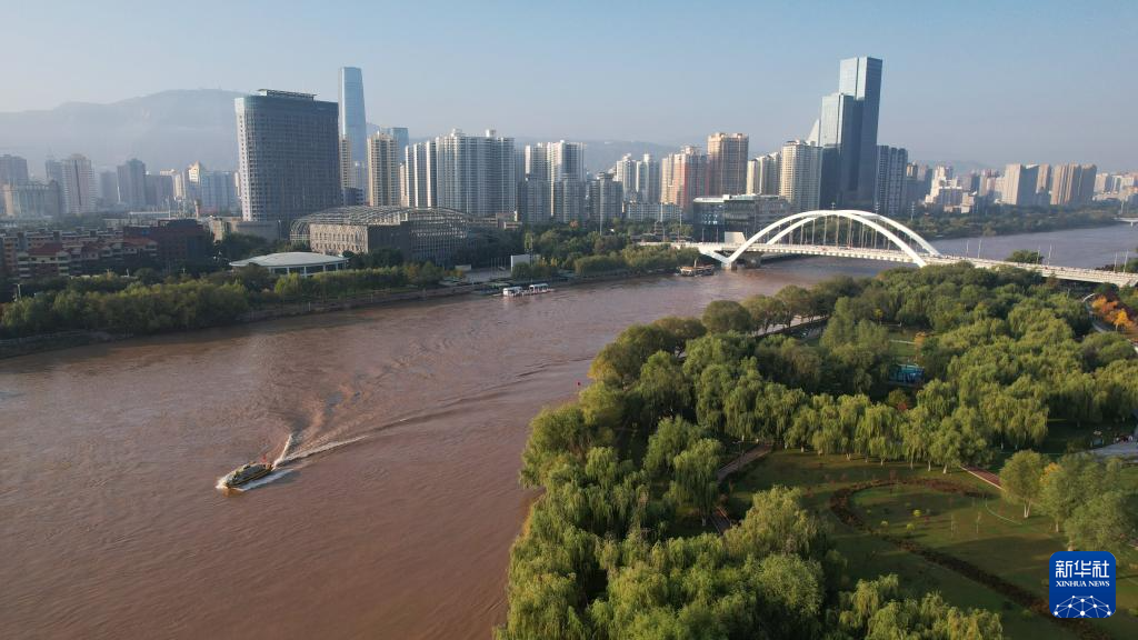 一艘水上巴士從黃河蘭州段航道上駛過(10月17日攝,無人機(jī)照片)。新華社記者陳斌攝