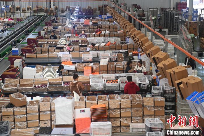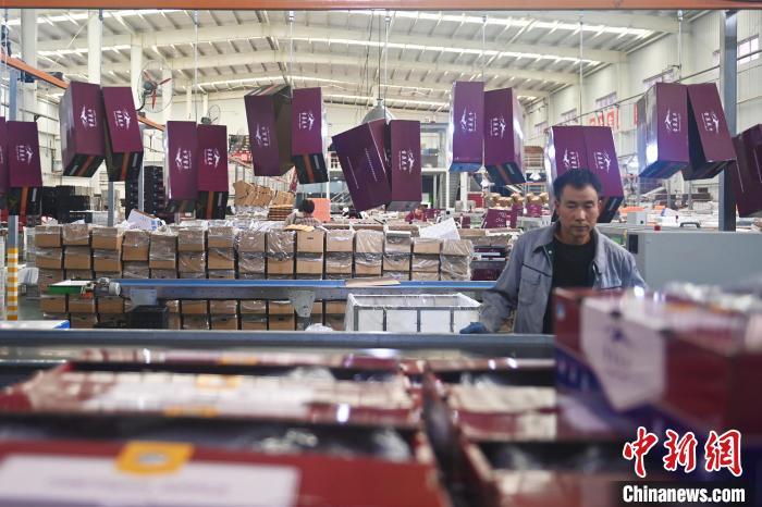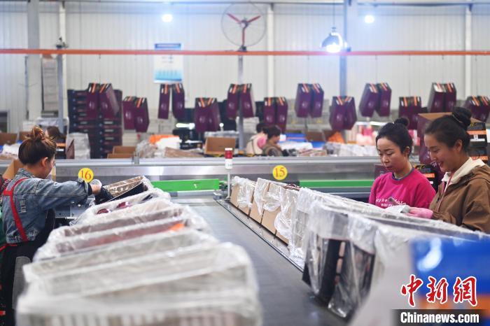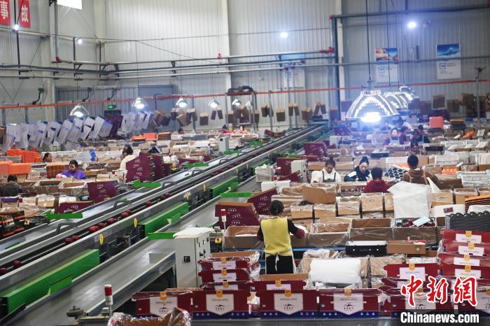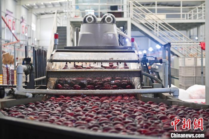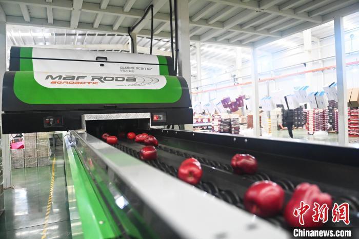 10月21日,在甘肅省天水市秦安縣雪原果品有限公司加工車間,蘋果自動化分揀線上工作人員進行分揀工作。該生產(chǎn)線每天能處理30噸蘋果,蘋果經(jīng)過設(shè)備水洗、烘干、稱重等環(huán)節(jié),進入不同等次的包裝線,工人們再對每顆蘋果進行復檢、貼標,分裝在不同規(guī)格的包裝箱中。甘肅秦安蘋果總面積61.37萬畝,產(chǎn)量86.8萬噸,產(chǎn)值55.6億元人民幣,先后從國內(nèi)科研院所引進青砧、M26、ZH5等抗重茬蘋果矮化砧木6個,配合國家蘋果產(chǎn)業(yè)技術(shù)體系,引進長富2號、煙富6號、煙富8號、瑞香紅等蘋果新品種12個。中新社記者李亞龍攝