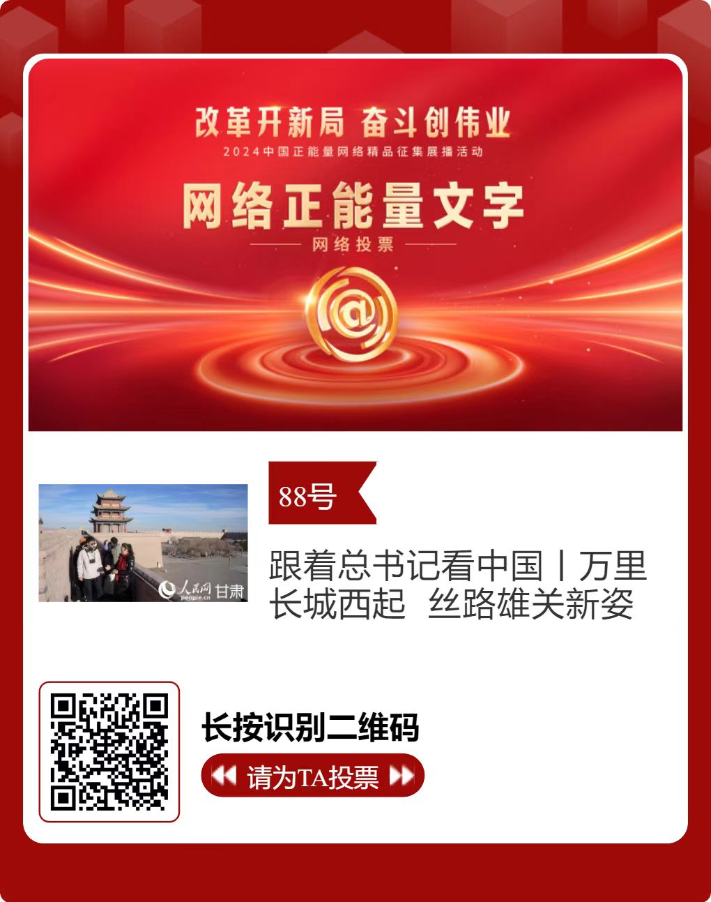 2024中國(guó)正能量網(wǎng)絡(luò)精品,嘉峪關(guān)入圍作品邀您投票!