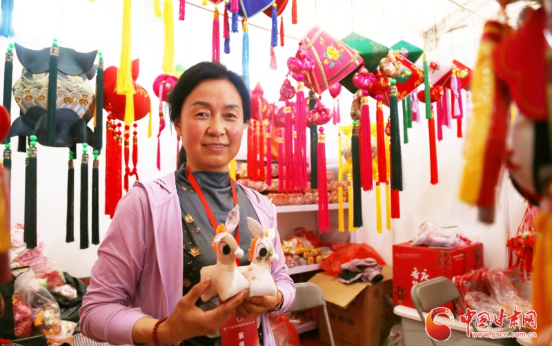 在展館的一角,來自慶城的一位香包繡制商戶喬志梅正在現(xiàn)場推銷著自己帶來的產(chǎn)品。其中驢形香包最為顯眼,據(jù)她介紹,驢形香包多數(shù)呈現(xiàn)黑色,有忠厚、老實之寓意,在當?shù)貥O受喜愛。但她制作的驢形香包,通體為白色,鬃毛為粉色,驢耳一上一下較為可愛俏皮。