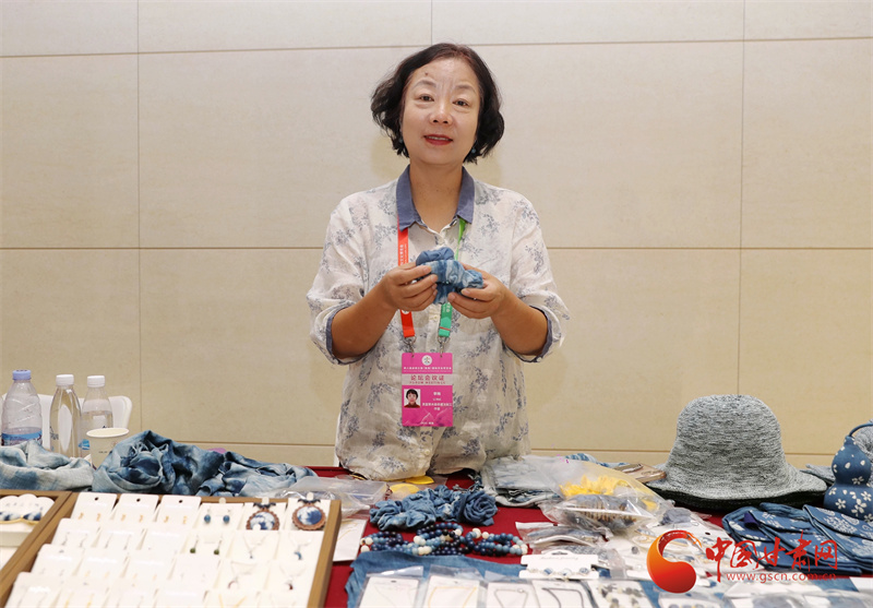 在第八屆進博會的現(xiàn)場,甘肅館以其獨特的人文底蘊吸引了眾多目光。展館內(nèi),弧形山脈造型的背景,仿佛展現(xiàn)著甘肅的壯美風(fēng)光,而慶陽香包、敦煌絲巾等精美展品,則如璀璨明珠,訴說著甘肅的文化魅力。就在這其中,來自平?jīng)龅墓欧ㄋ{(lán)染技藝展臺格外引人注目,一件件藍(lán)染作品散發(fā)著獨特的草本氣息,向世界展示著非遺的獨特魅力,而這些作品的創(chuàng)作者,正是平?jīng)鏊{(lán)染技藝的市級非遺傳承人李梅。