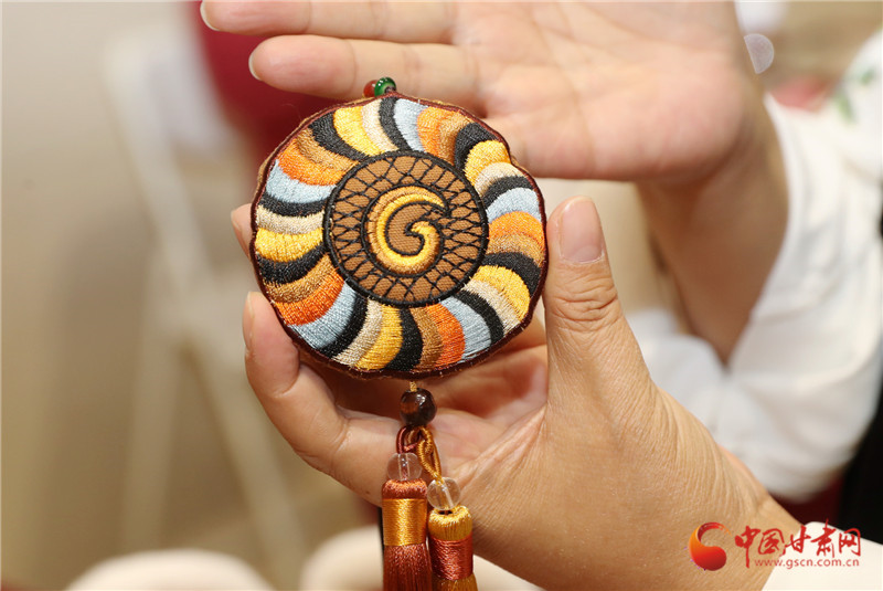 真正讓她想“給香包加點新東西”,是一次省博看展的觸動。站在馬家窯彩陶罐前,她盯著罐身流轉(zhuǎn)的旋渦紋出了神:“這么好看的紋路,繡在香包上多妙?”后來去敦煌,莫高窟里飛天的飄帶、藻井的繁復花紋更讓她挪不開腳?;貋淼穆飞希粋€念頭愈發(fā)清晰:要讓博物館里的文物“活”在香包里,讓老手藝沾染上“文化氣”。