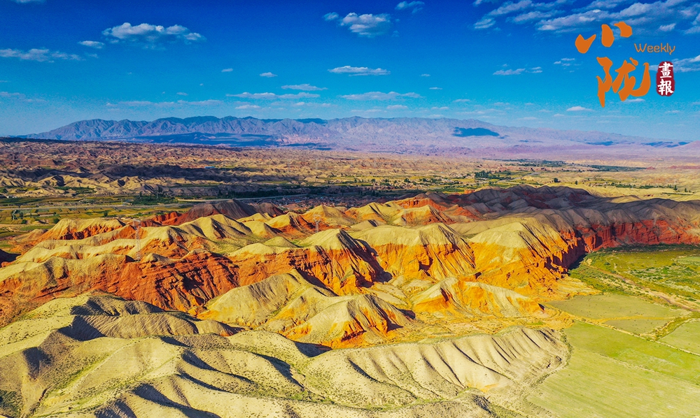 極目遠(yuǎn)眺,丹霞丘陵在廣袤的黃土高原上奔騰不息,猶如一座座火焰山。朱砂紅如烈焰燃燒,赭石黃似大地厚土,青黛綠若幽谷深潭,間或夾雜著沉穩(wěn)的灰褐,共同編織出一種難以言喻的斑斕與和諧。