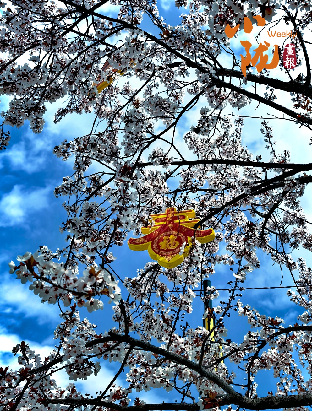 繁茂的櫻花綴滿枝頭,潔白的花瓣在藍(lán)天映襯下愈發(fā)清麗。枝椏間懸掛的“春福”掛飾,為春日街景添了暖意,風(fēng)過(guò)處,落英繽紛,滿眼浪漫與祥和。