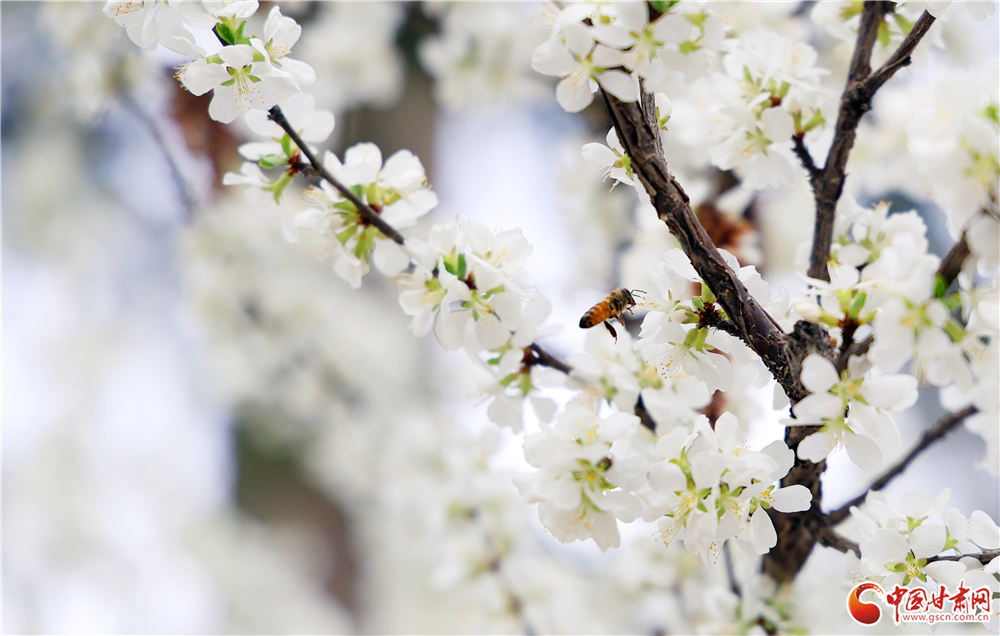 一只蜜蜂停駐花間,振翅采蜜,在純白的花海中增添了靈動(dòng)生機(jī)。各類春花次第開放,白的素雅、粉的嬌嫩、紅的熱烈,為市民獻(xiàn)上一場春日視覺盛宴。