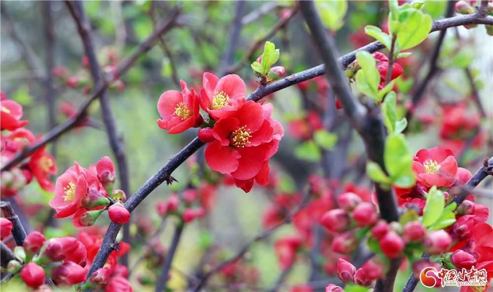 貼梗海棠熱烈綻放,艷紅的花朵綴滿枝頭,與嫩綠新葉相映成趣,引得游人駐足觀賞、拍照打卡。