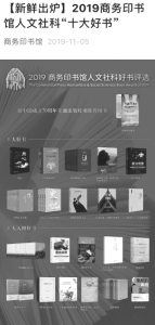 “商務印書館人文社科好書評選”被中央電視臺等媒體稱為“年度圖書榜單風向標”。每每公布后,央媒及主流媒體都會予以報道,同時在新媒體平臺也會進行系列宣傳,比如2019年的好書評選人民日報官方微信發(fā)布后一天內(nèi)的閱讀量便超過了888萬。