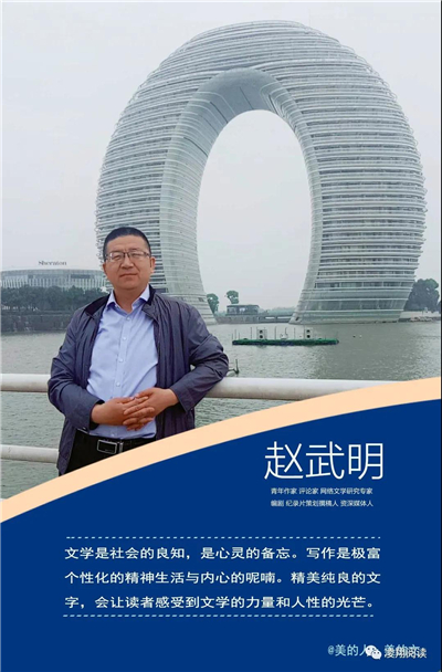 懷瑾握瑜,勤耕不輟。趙武明的寫(xiě)作是安靜的,由于從事20余年的新聞工作,給他貯存了很多素材,所以他涉獵的寫(xiě)作范疇很廣,寫(xiě)散文隨筆、文藝評(píng)論、紀(jì)錄片、微電影、大型晚會(huì)總撰稿,還研究網(wǎng)絡(luò)文學(xué)。如果說(shuō)文字是會(huì)呼吸的,趙武明的文字除了唯美,更多的是硬骨錚錚,也不乏柔腸的峻厲和倬約,風(fēng)姿獨(dú)具,淡雅濃烈,相得益彰,簡(jiǎn)約獨(dú)立,一語(yǔ)千里,蘊(yùn)含張力。他常說(shuō),寫(xiě)作要穿透人心抵達(dá)靈魂。向外,不斷追求生命更高的境界;向內(nèi),不斷觸及心靈。