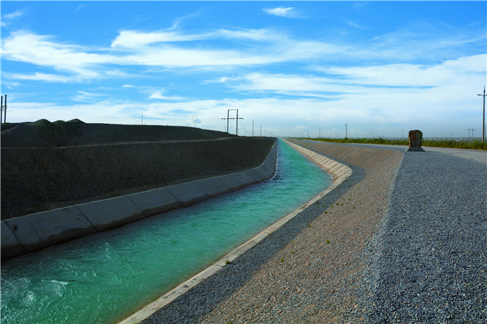 關外草青塵土偃,絲路迢迢遠。引水灌農(nóng)田,澤潤橋灣,圓夢荒灘菀。