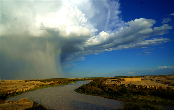 戈壁晚霞和暮鼓,疏勒河流古。聽靜水流深,百轉千回,澤潤荒原土。